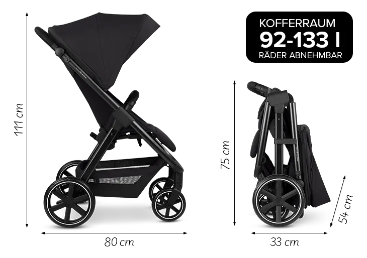 L'Avus 2 ne manque pas non plus de confort de poussée : le frein d'immobilisation se trouve directement sur la roue arrière droite. Ainsi, l'essieu arrière n'est pas nécessaire. Cela vous permet non seulement de gagner du poids et de l'espace, mais aussi de disposer de plus de place pour les jambes lorsque vous poussez l'enfant. Un vrai plus pour les parents de grande taille.Grâce aux grandes roues avant et arrière, l'Avus 2 est convaincant aussi bien en ville que sur les terrains faciles. Grâce à la suspension intégrée de la poussette compacte, les roues assurent une conduite silencieuse sur tous les terrains.