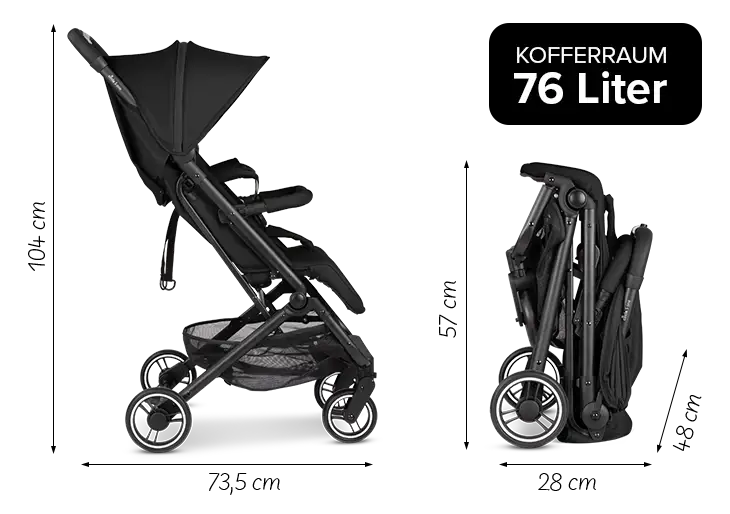D'une seule main, tu peux facilement diriger la poussette compacte, la plier et la replier. Grâce à sa dimension de pliage extra compacte, tu peux la ranger facilement ou l'emporter en voyage - même en avion.