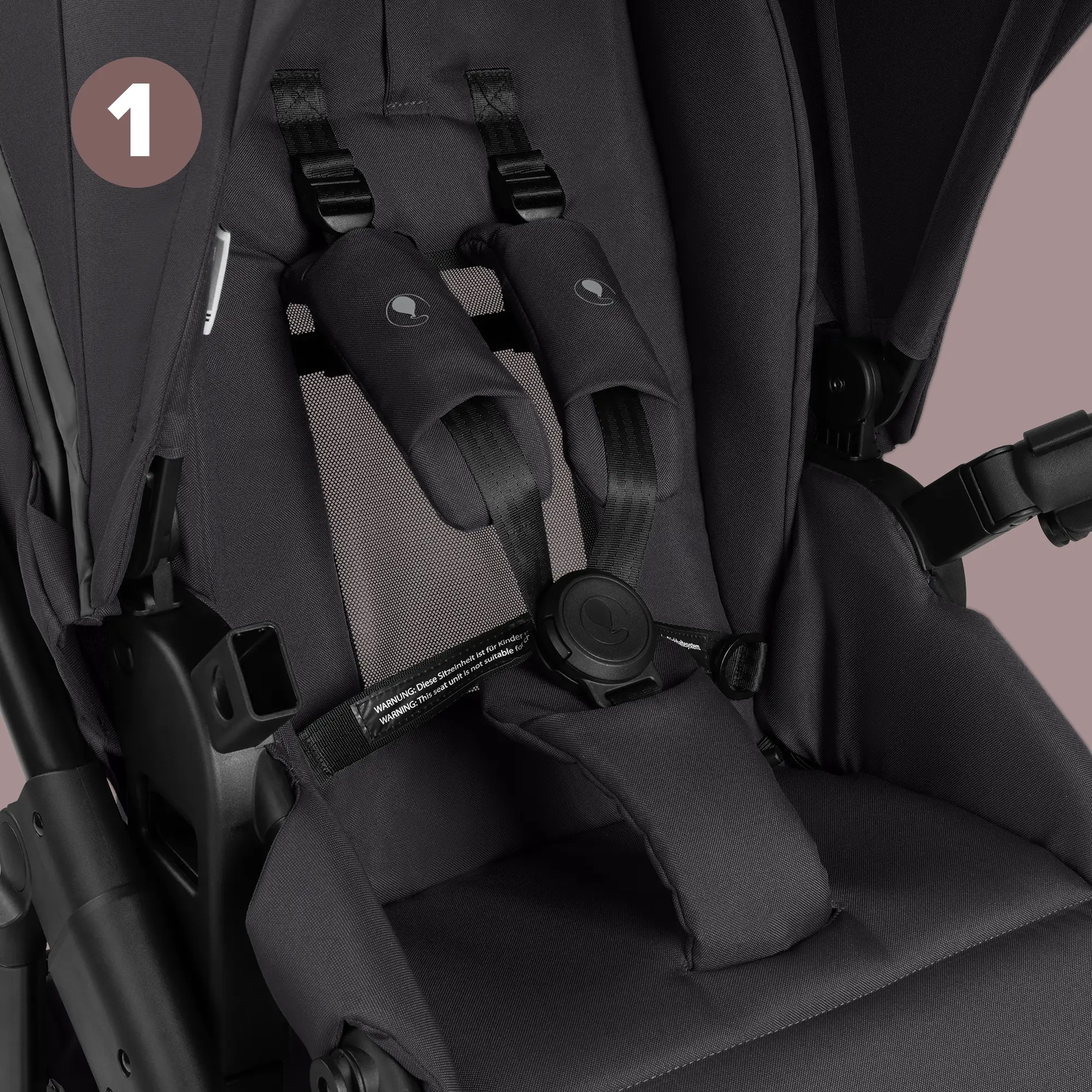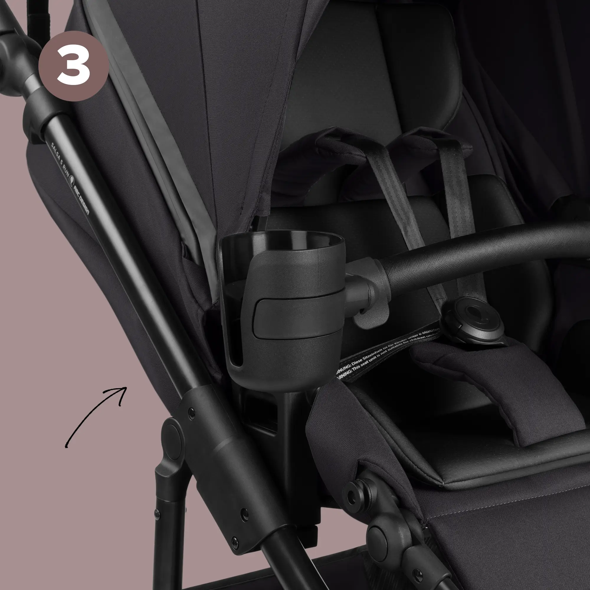 Lorsque vous portez votre bébé dans vos bras, vous pouvez désormais rabattre facilement le canopy de la nouvelle nacelle vers l'arrière d'une seule main. Pour cela, il suffit d'appuyer brièvement sur le bouton situé de chaque côté afin de déverrouiller le réglage du canopy. Sur le modèle précédent, il fallait appuyer simultanément sur les deux boutons de déverrouillage, ce qui n'était pas possible d'une seule main. Vous apprécierez ce gain de confort au quotidien.